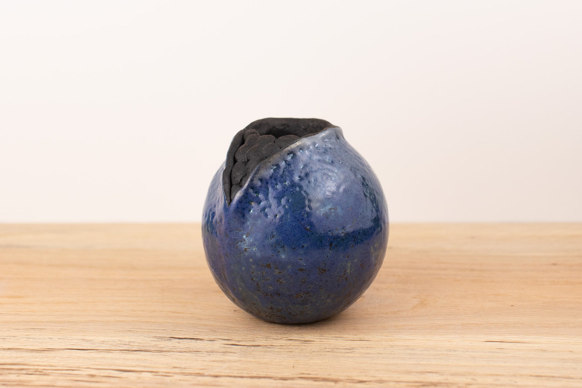Each raku vase is a one-of-a-kind piece, created by using an ancient Japanese firing technique. The pottery is pulled from the kiln while red-hot and placed in a chamber with combustible materials, creating unpredictable textures, colors, crackles, and smoky effects.