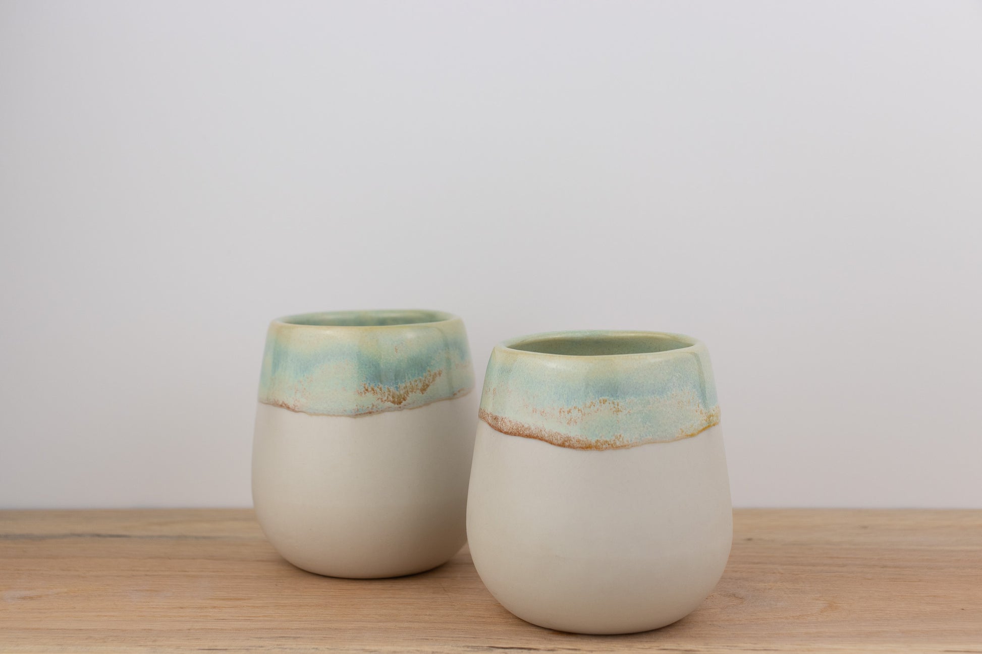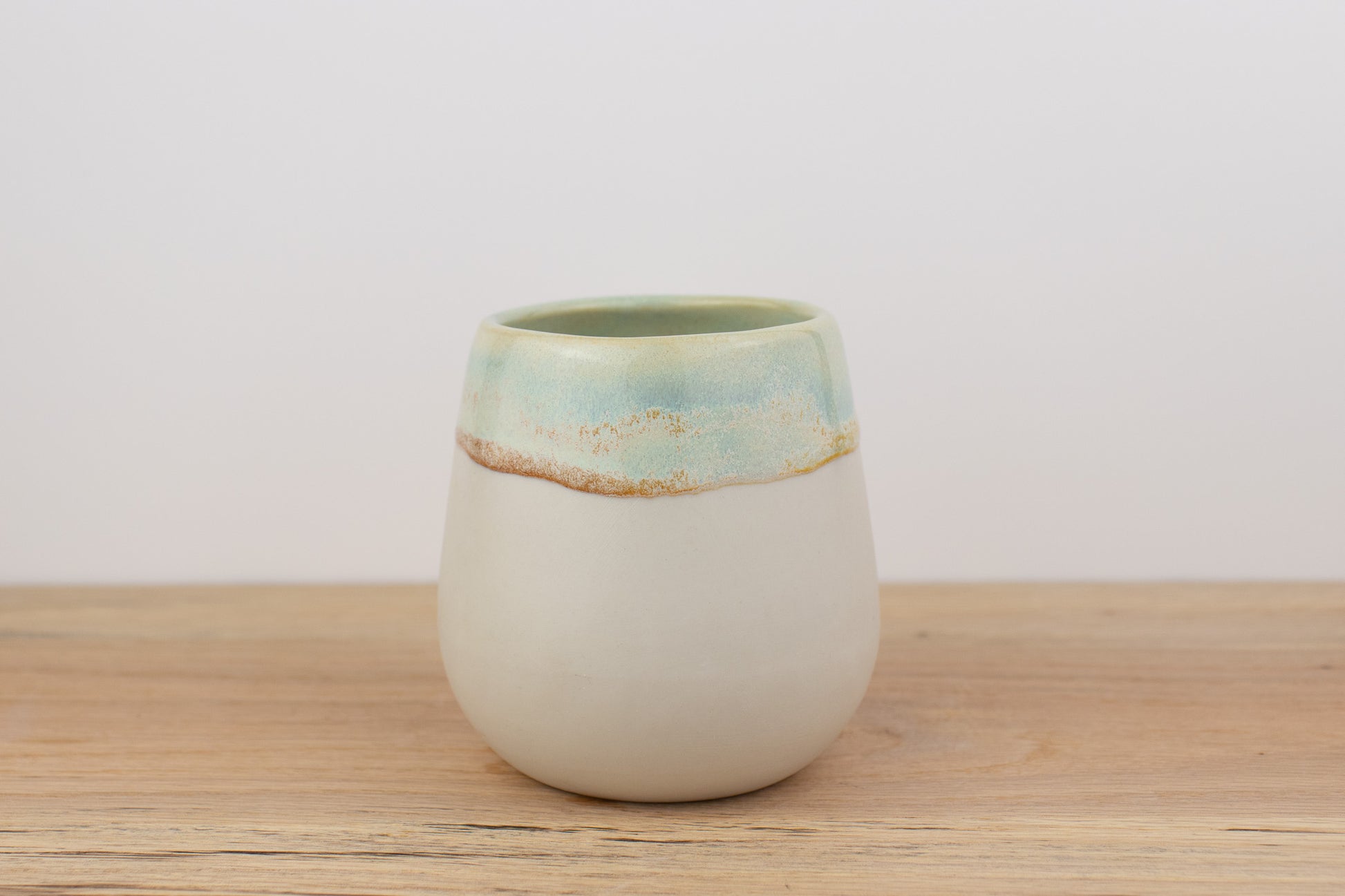 The cape summers stemless wine glass is a celebration of movement and color. Layers of soft blues, greens, and honey blue cascade down the smooth ceramic surface, creating organic patterns that feel alive with every pour. The flowing glaze meets a white porcelain base in bold contrast, making each glass entirely one-of-a-kind.