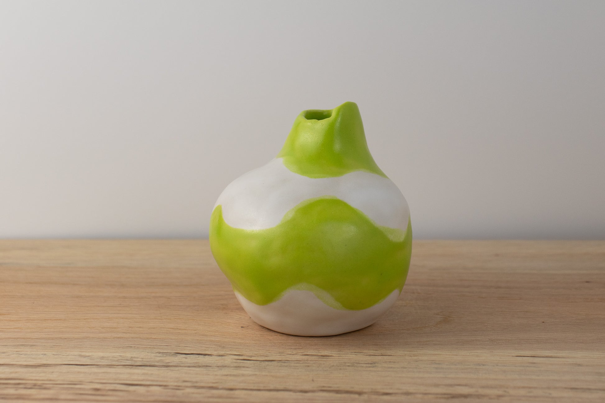 chaotic good vase 03 is a small bud vase with a playful, organic form. The rounded body and hand-applied chartreuse glazing give it an easy sense of movement. It’s watertight, so it’s perfect for a single stem or a sprig of something wild, or simply styled on its own as a pop of color on a shelf or side table. A little unexpected and a little joyful, this piece adds a bright, artful touch to everyday spaces.