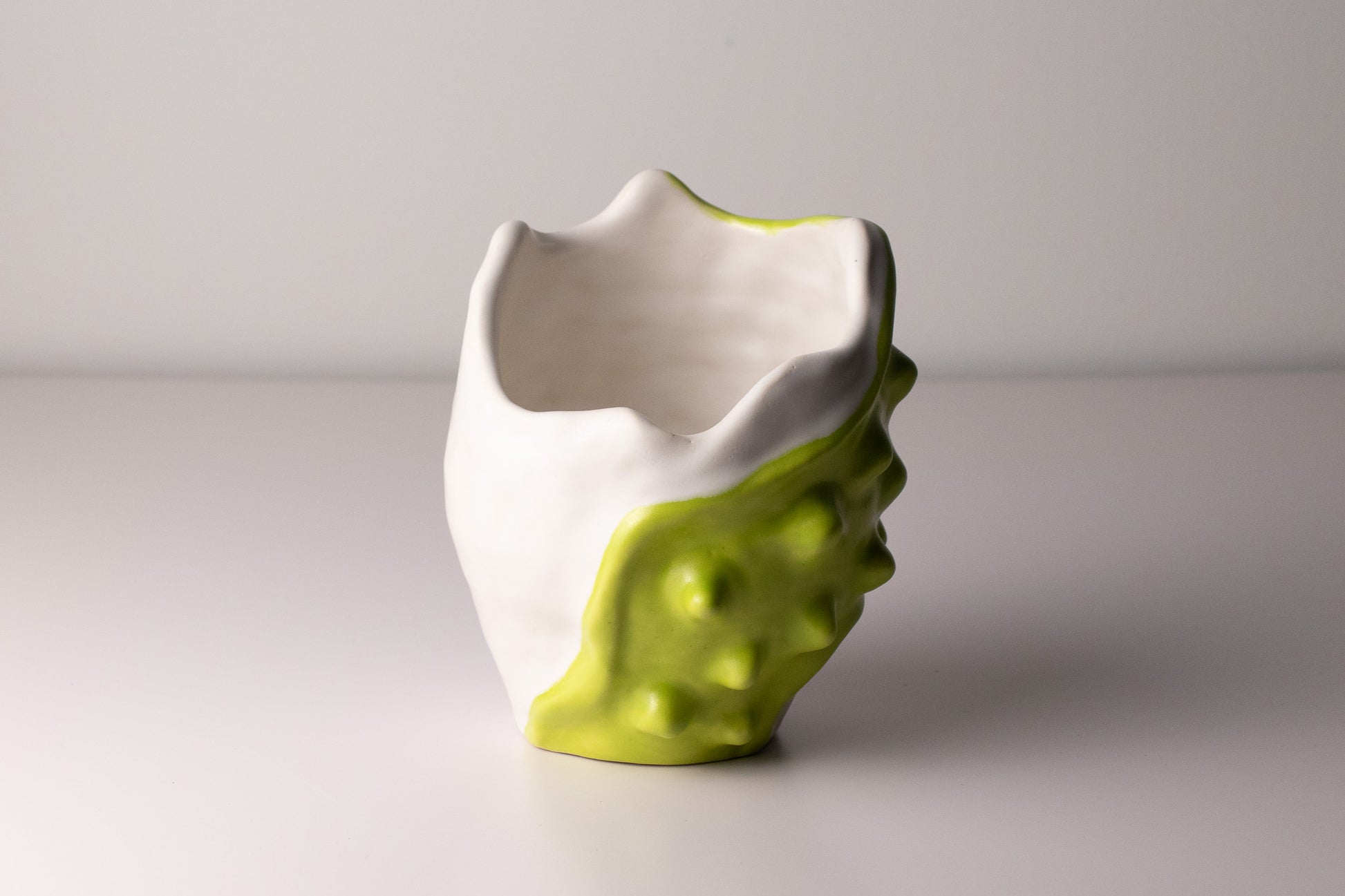 chaotic good vase 04 brings a punch of personality to any space with its electric chartreuse glaze and wildly tactile surface. This one-of-a-kind form blends matte white with a burst of spiky, organic texture that feels equal parts joyful and mischievous. It’s sculptural, bold, and undeniably fun—made for collectors who love pieces that don’t take themselves too seriously while still standing out as contemporary art.