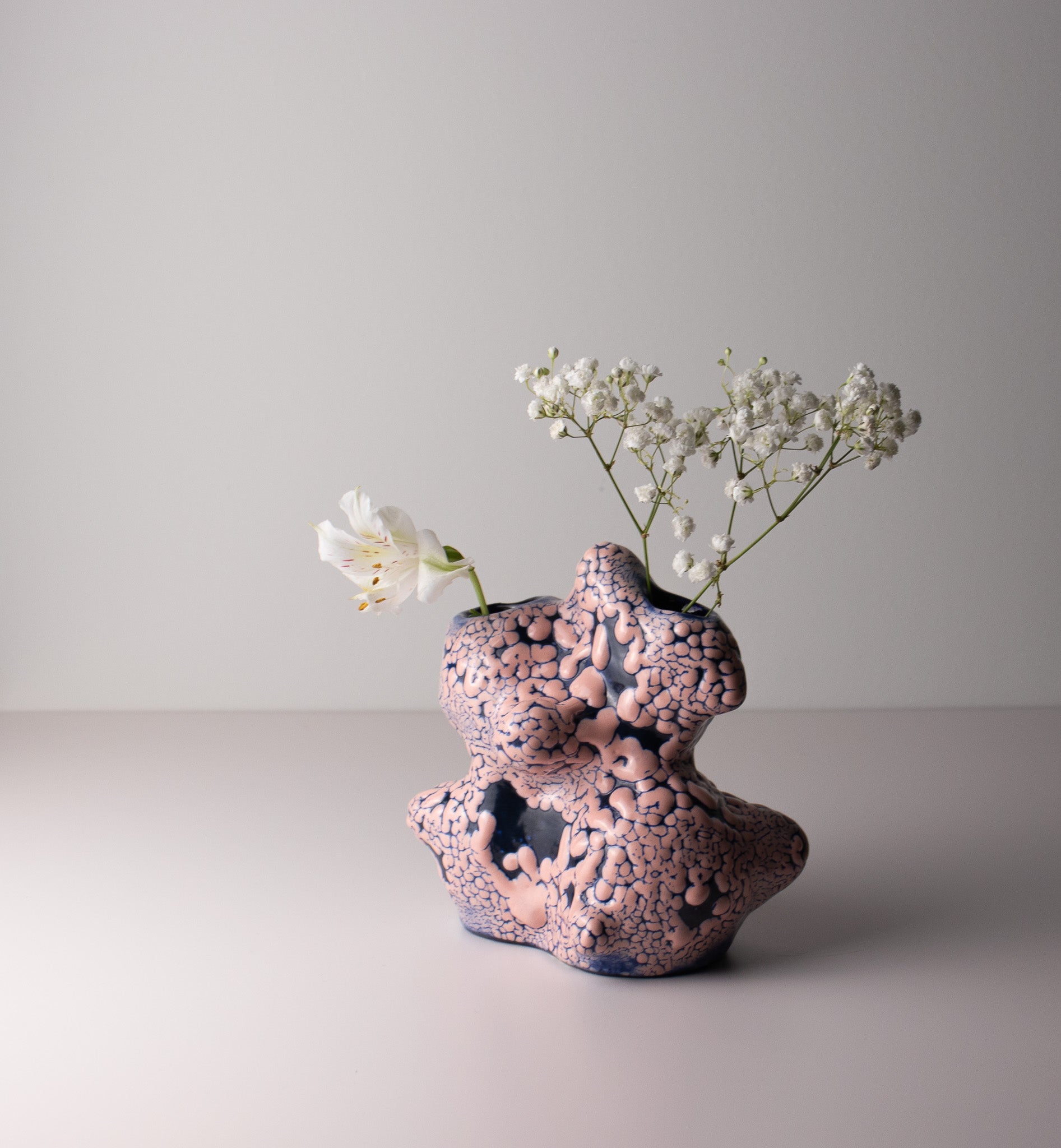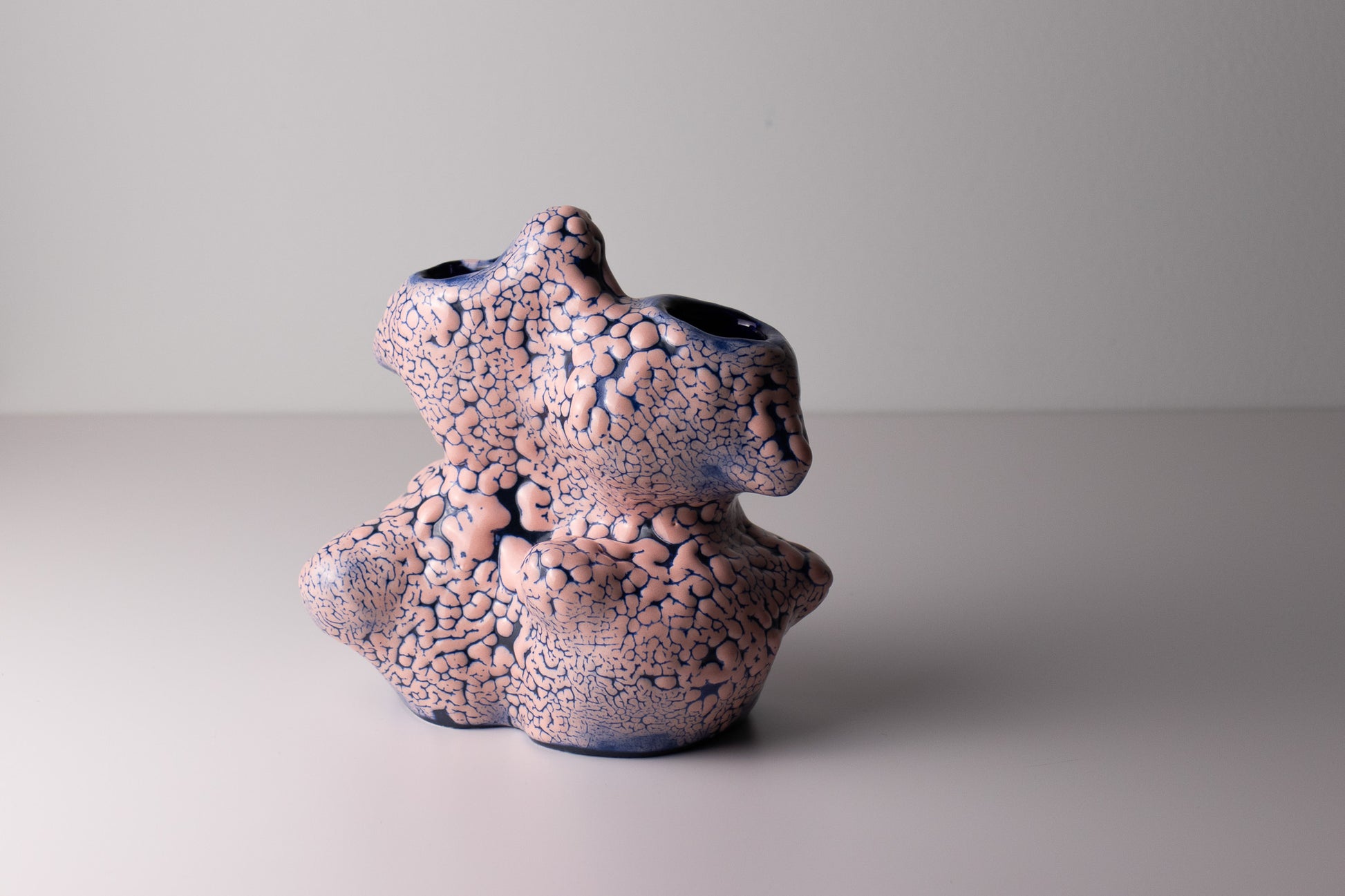 Handbuilt ceramic vessel with an organic form and dual openings.