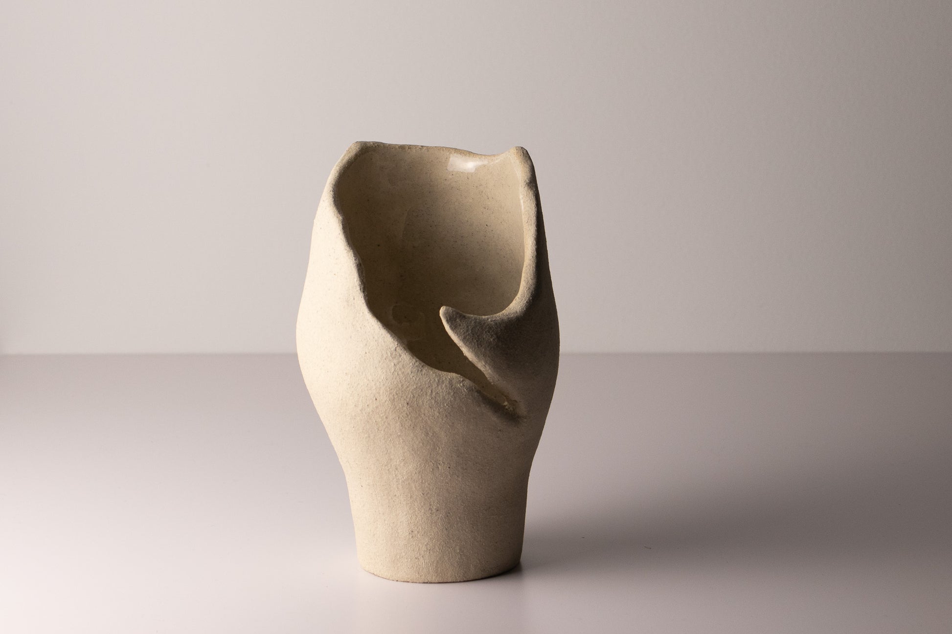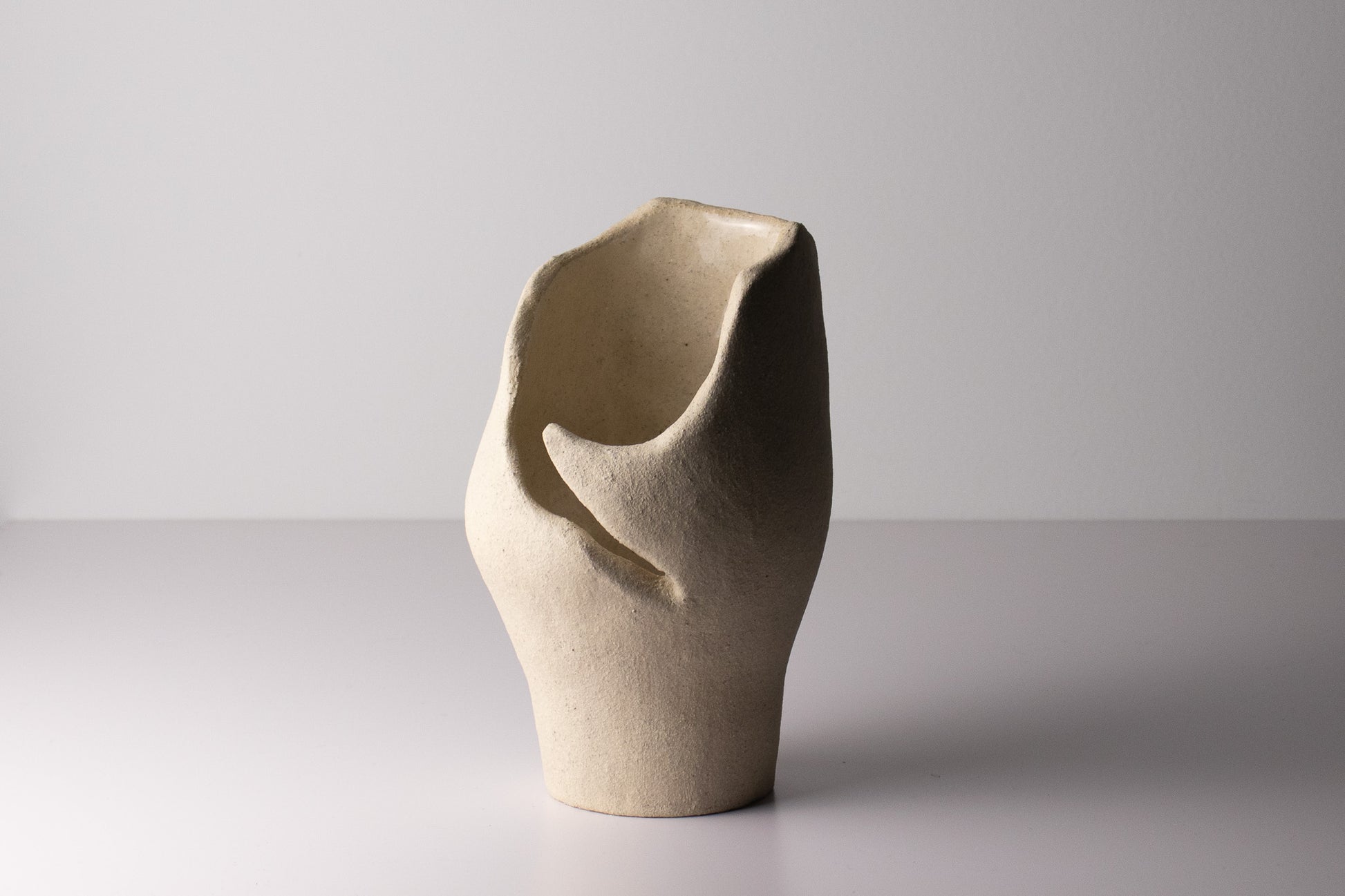 An understated sculptural vessel defined by a rounded form, an organic neck, and a natural, unglazed finish.