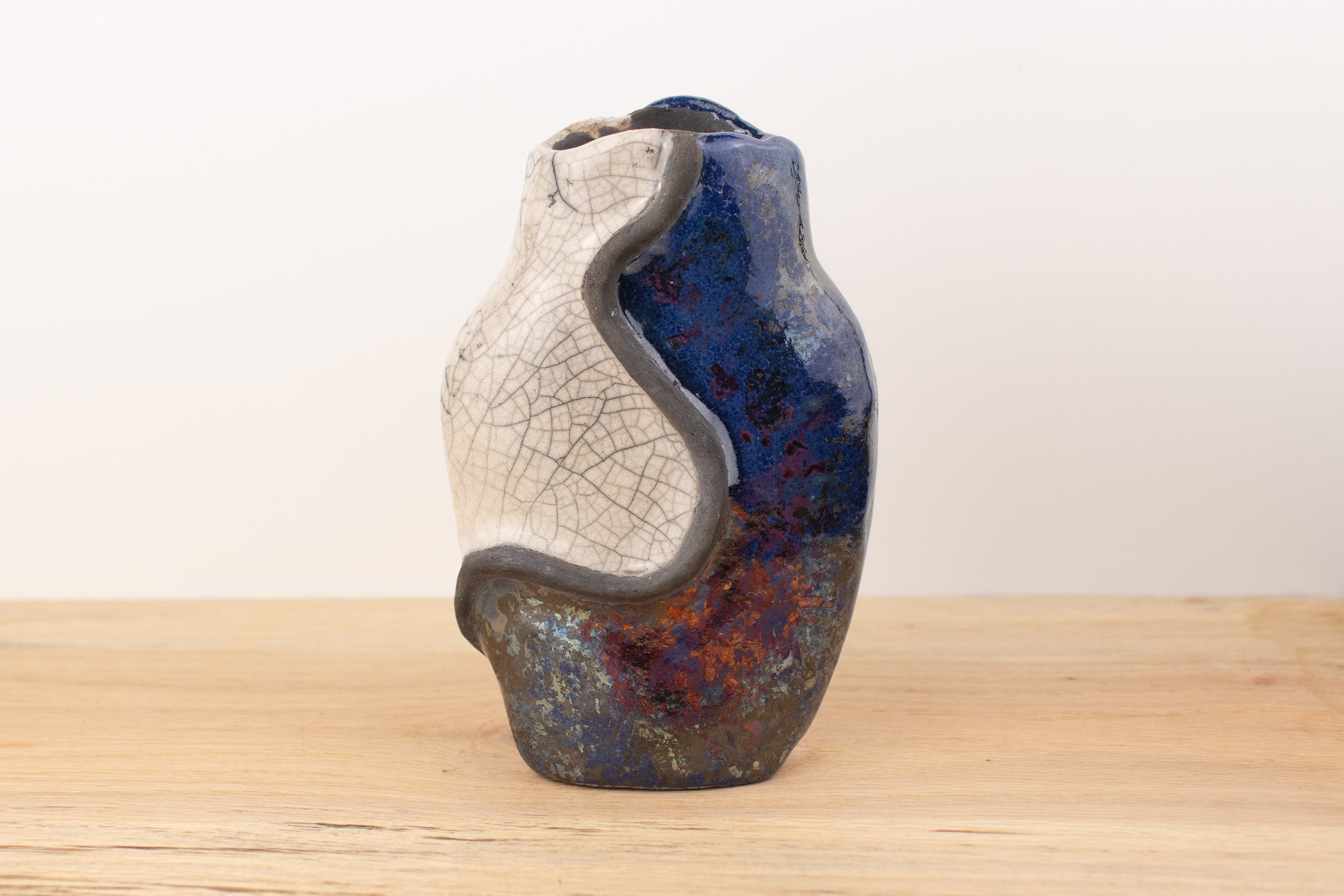 from embers vase 01 is a raku vase with a surface that shifts depending on the light and the angle. One side features a smoky crackle glaze, while the other moves from deep blue to copper and violet tones — like embers cooling after a fire. Small and impactful, it’s a piece that changes with the room and invites a second look. Best styled with dried or sculptural stems, or displayed on its own as an art object.