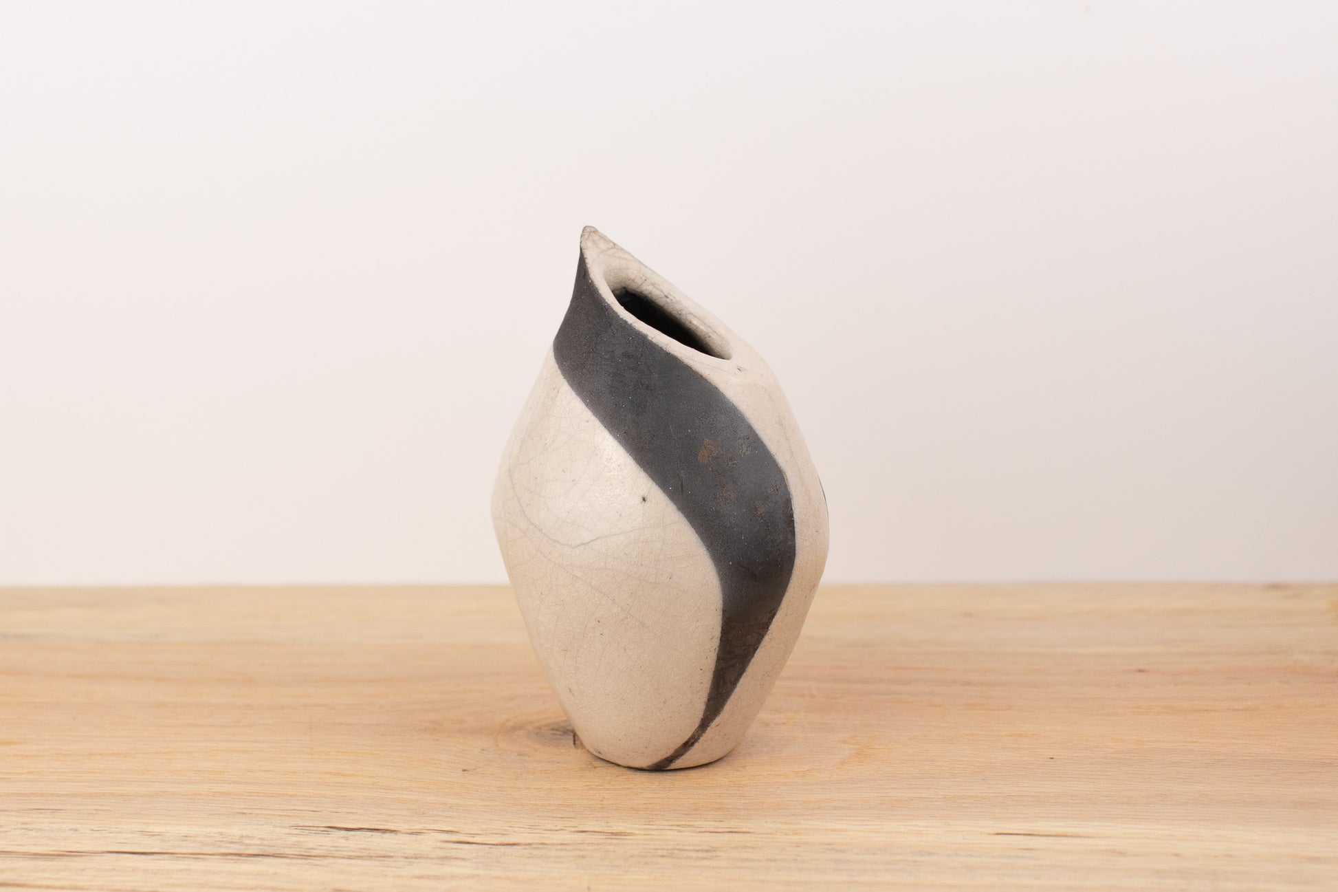 mavericks vase 02 is a raku piece with a soft, smoky crackle surface and a sweeping matte black stripe that wraps around the form. The shape has a quiet sense of movement, like a wave caught mid-crest. Best styled with dried stems or left on its own as an art object — a piece that brings depth, contrast, and a touch of edge to a shelf or side table.