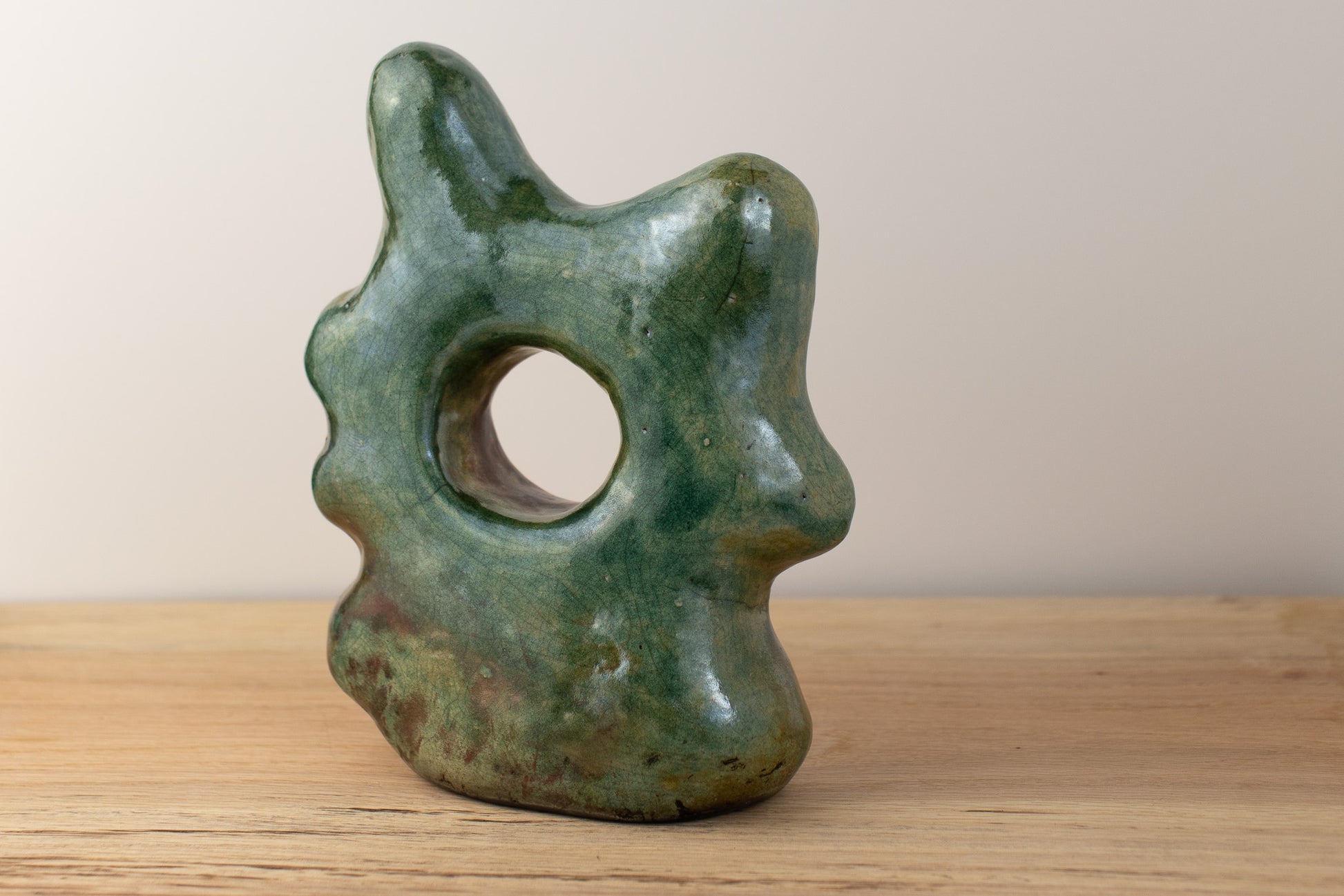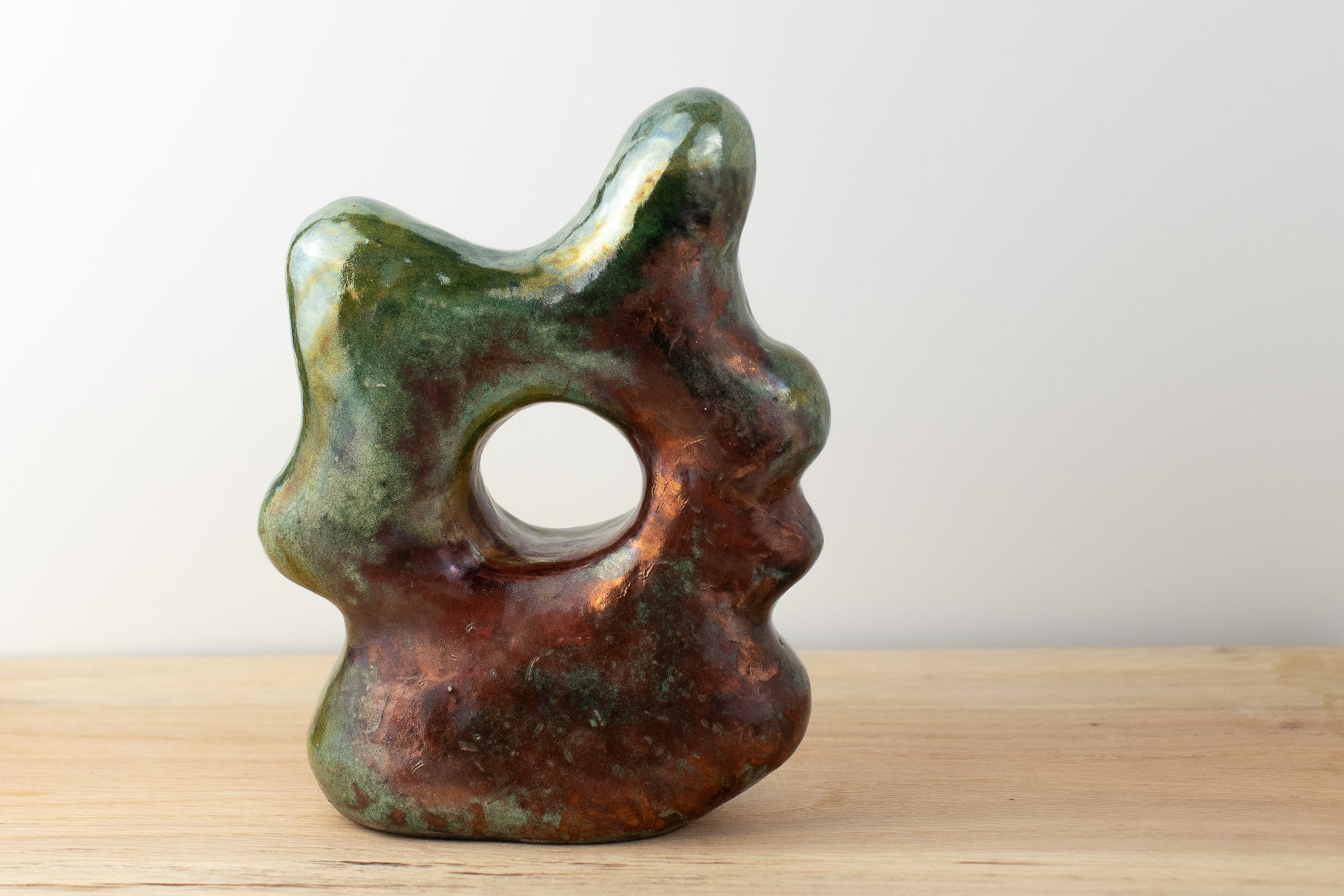 phoenix sculpture 01 is a one-of-a-kind abstract raku sculpture with a fluid, organic silhouette and a glossy, shifting surface. The glaze moves between deep greens and warm copper tones, with subtle hints of purple and blue that catch different light throughout the day. The surface shows fine crackle lines and natural variation from the raku firing process, making the piece feel alive and ever-changing.