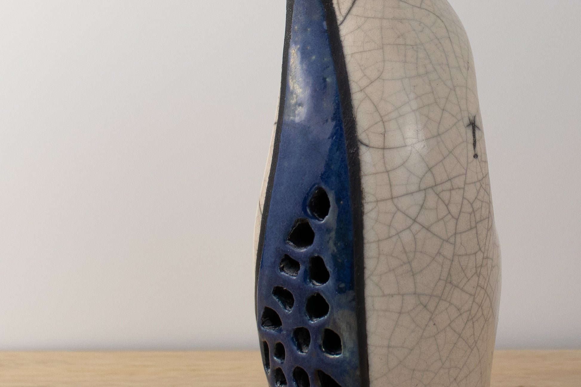 quiet tide sculpture 02 is a raku piece with a soft, organic silhouette. One side features a glossy crackle surface that captures light in a subtle, understated way, while the other shifts between deep blue and sea-green tones. Along the blue edge, hand-carved openings add depth, shadow, and a sense of movement — like tide pools revealing what’s beneath the surface. This is a piece that feels calm and grounded, yet quietly expressive. Display it on a bookshelf, side table, or entryway to bring a gentle sculptural presence into your space.