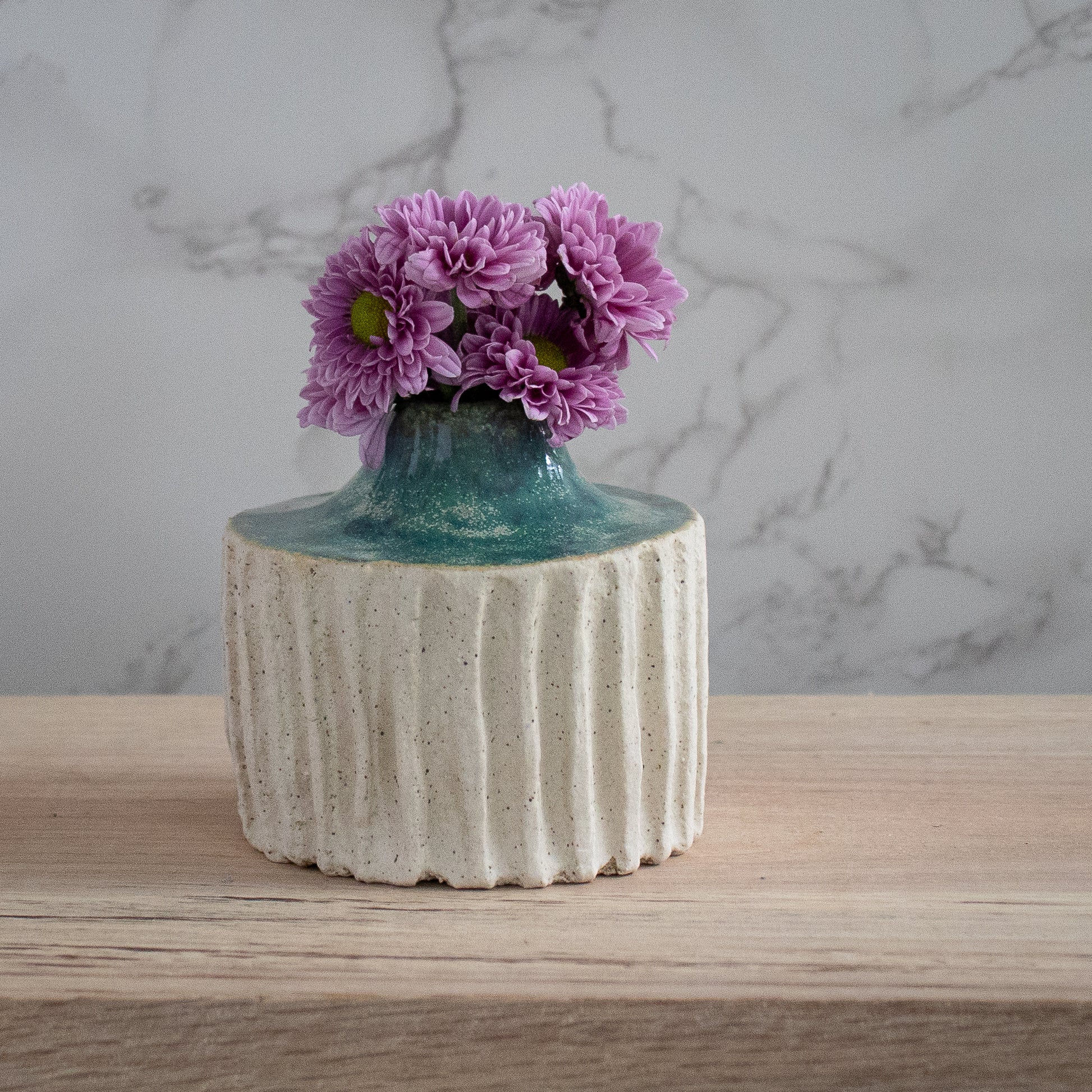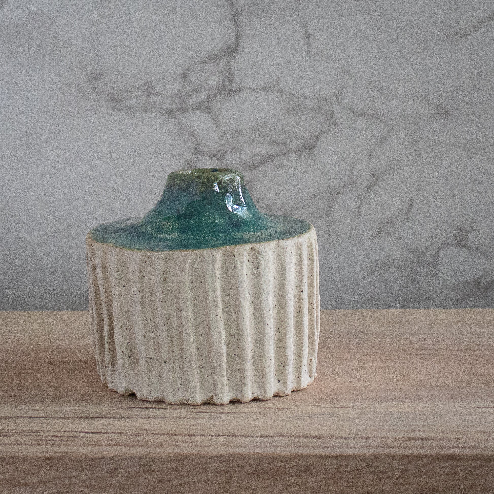 The seagrass bud vase is a charming, handcrafted piece designed to bring subtle elegance to your floral arrangements. Featuring a dual-tone finish with a glossy green glaze reminiscent of lush seagrass and an unglazed textured neck, this bud vase blends natural beauty with modern design. Compact in size, it is water-tight, making it ideal for displaying fresh flowers or petite bouquets.