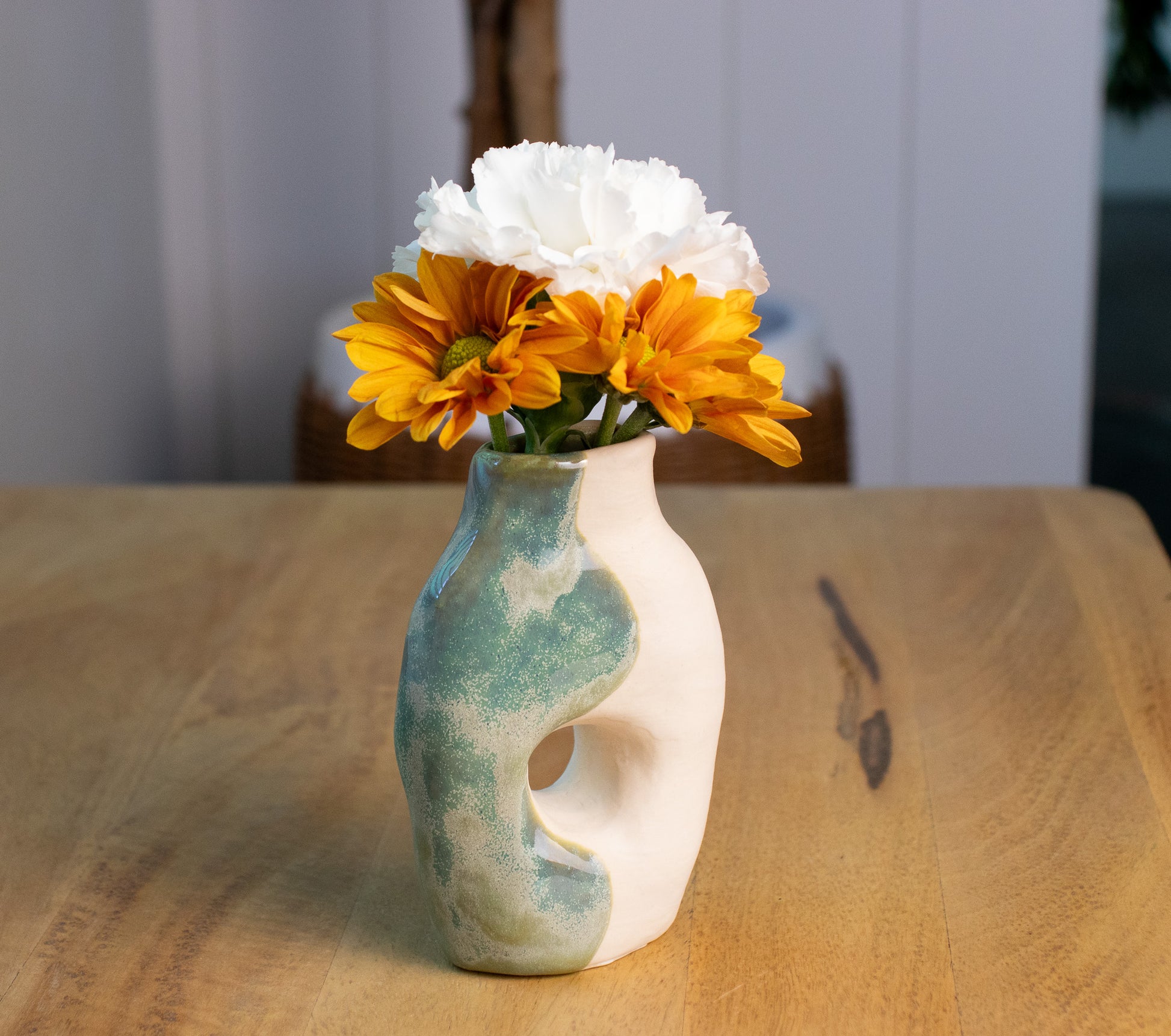shoreline vase 01 blends soft, organic form with a calming mix of matte cream and glossy ocean-green glaze. Hand-built with gentle curves and a sculptural cutout, it brings a touch of movement and ease to any space—like sunlight reflecting over tide pools. Style it with a single stem, a clipped garden sprig, or let it stand on its own as a small piece of art on a shelf, bedside table, or kitchen ledge. Water-tight for fresh florals, but equally beautiful unfilled.