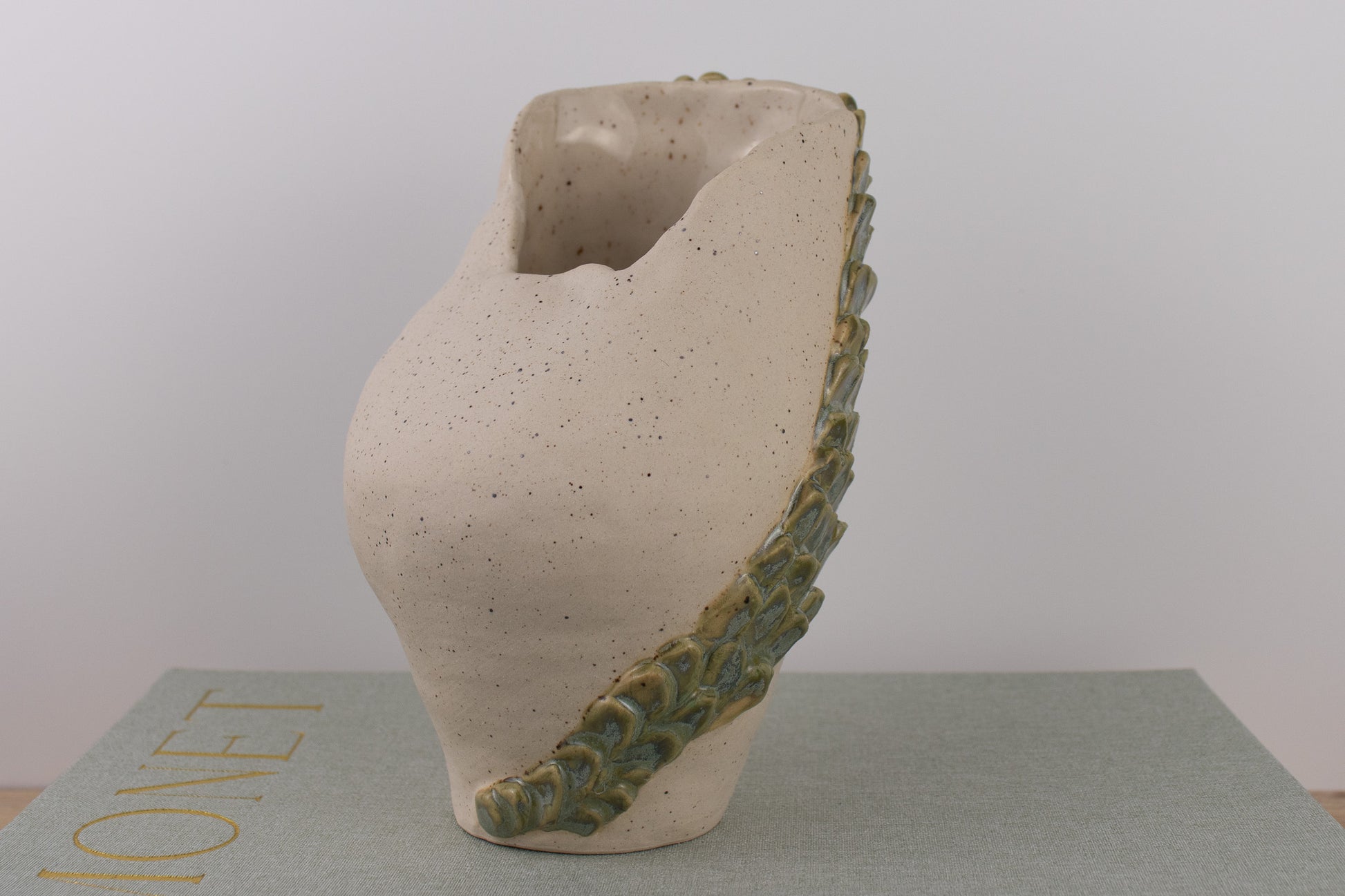soft relief study vase 02 has a matte speckled surface paired with a cascading glossy relief detail that wraps gently along one side. The organic neck and hand-formed silhouette give it a soft, sculptural presence — the kind of piece that feels both refined and easy to live with. It’s watertight, making it perfect for a bouquet flowers, though it stands beautifully on its own as a quiet textural accent on shelves, nightstands, or side tables.
