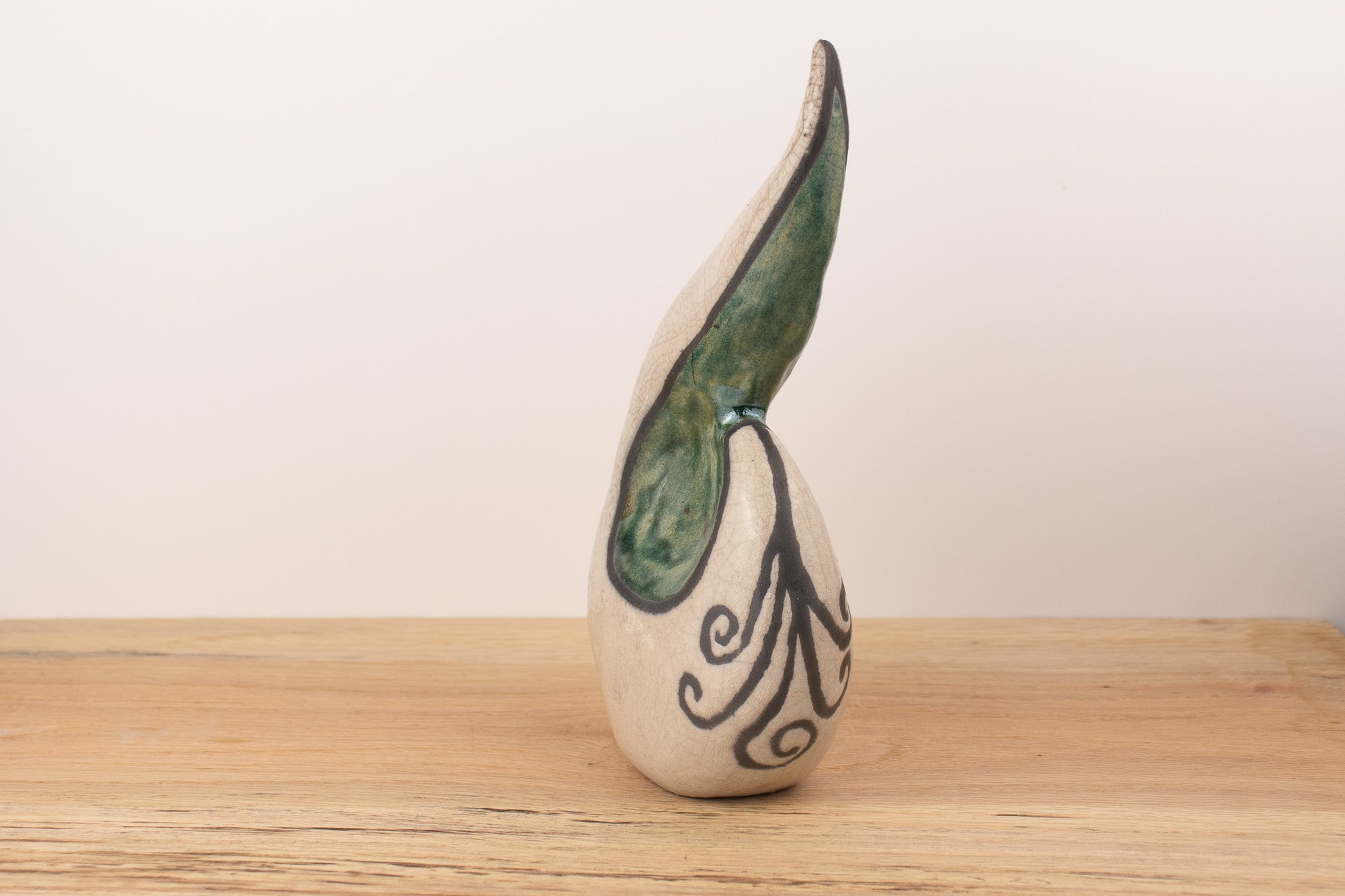 unfurl sculpture is a raku-fired piece with a form that curves upward, almost like something growing or unfolding. The surface features smoke crackle, hand-drawn linework, and a soft wash of green glaze that brings a quiet, expressive presence to shelves and tabletops, adding a touch of nature-inspired character to any space.