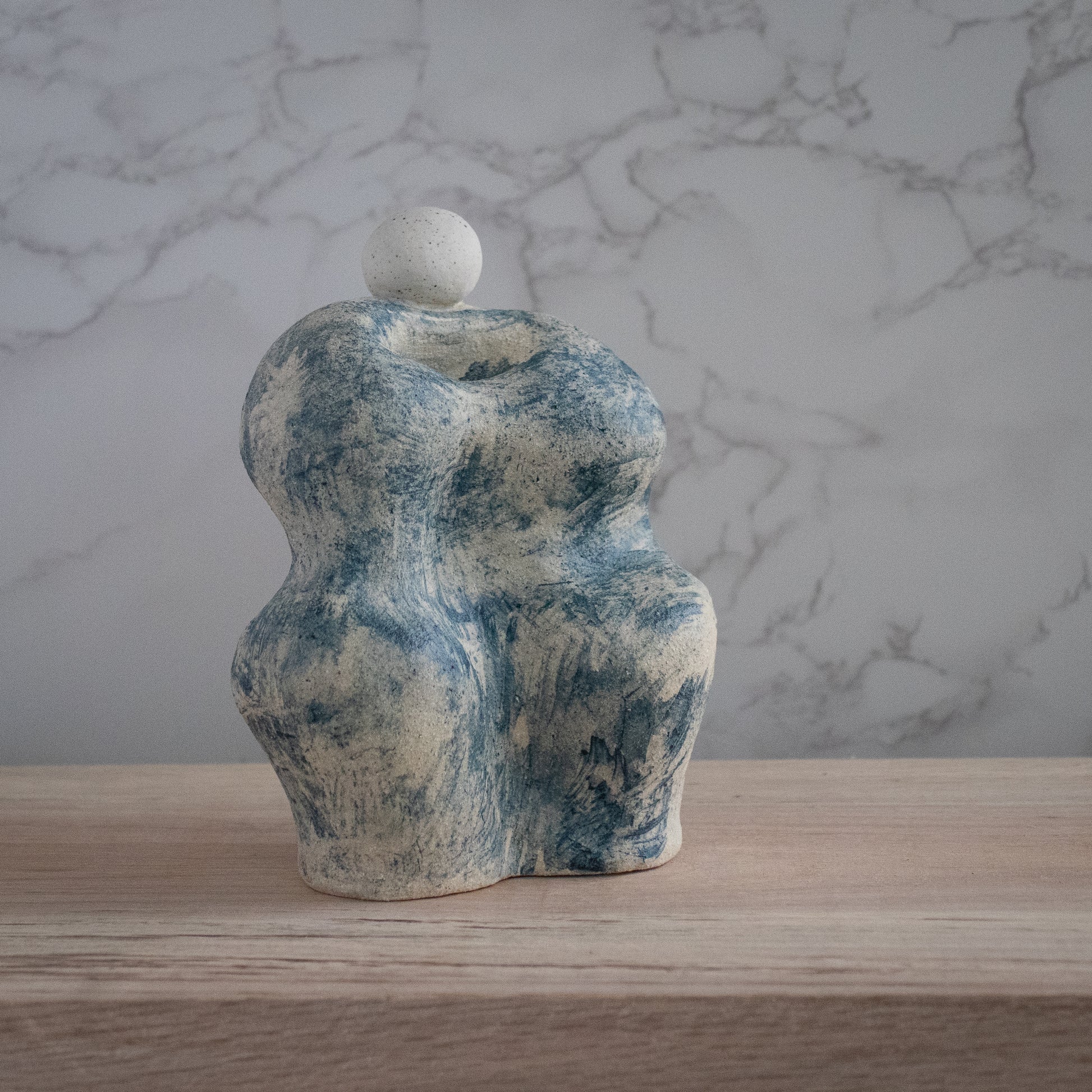 The woman of the sea sculpture captures the fluidity and strength of the ocean in a striking, hand-built ceramic form. This piece evokes the curves of the human figure, shaped as if sculpted by the movement of waves. The marbled blue and white surface resembles seafoam meeting the shore, while the speckled sphere resting atop the form adds a playful, celestial touch—like a pearl rising from the ocean's depths or the moon casting its light on the water.